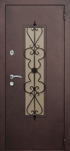 Дверь входная « Коваль» подходит для разных типов помещений. Дверь сочетает в себе надежность и привлекательный дизайн (стеклянные элементы скомбинированы с художественной ковкой). Переносит непогоду. Конструкция подойдет для установки в загородные дома.